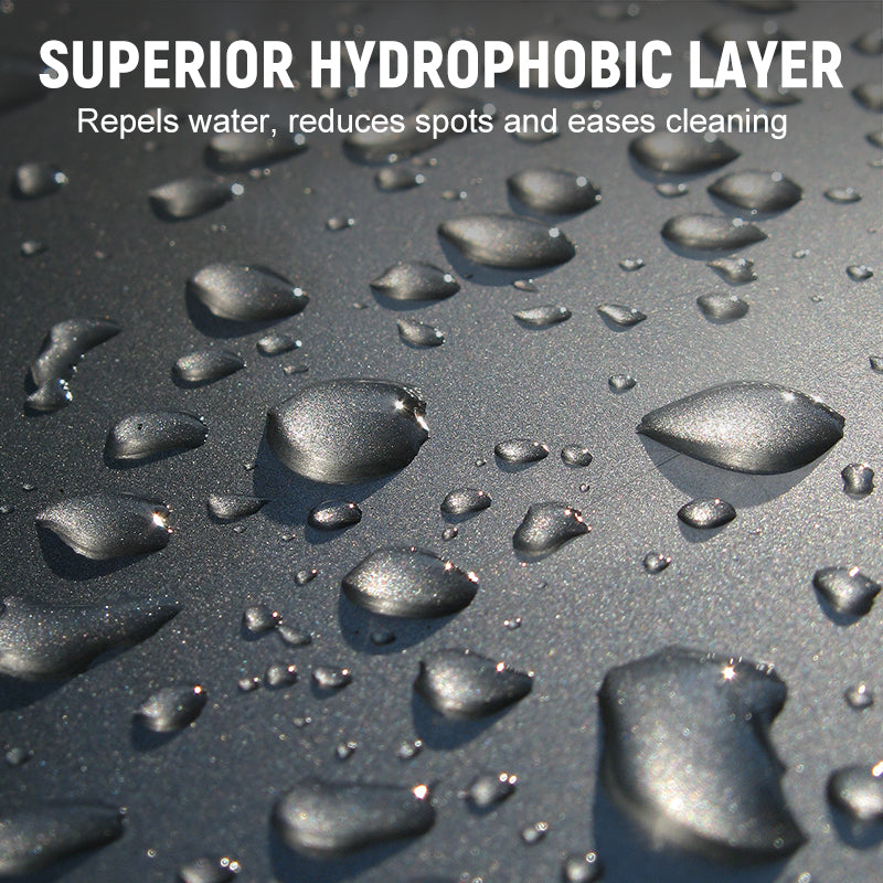 REVÊTEMENT HYDROPHOBE SUPÉRIEUR - Crée une puissante barrière hydrofuge qui fait perler et rouler l'eau. Cet effet minimise les taches d'eau et facilite le nettoyage de la saleté et de la crasse, gardant votre voiture plus propre.